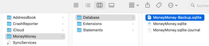 Duplizieren Sie die Backup-Datenbank «MoneyMoney-Backup.sqlite» und benennen das Duplikat in «MoneyMoney.sqlite»