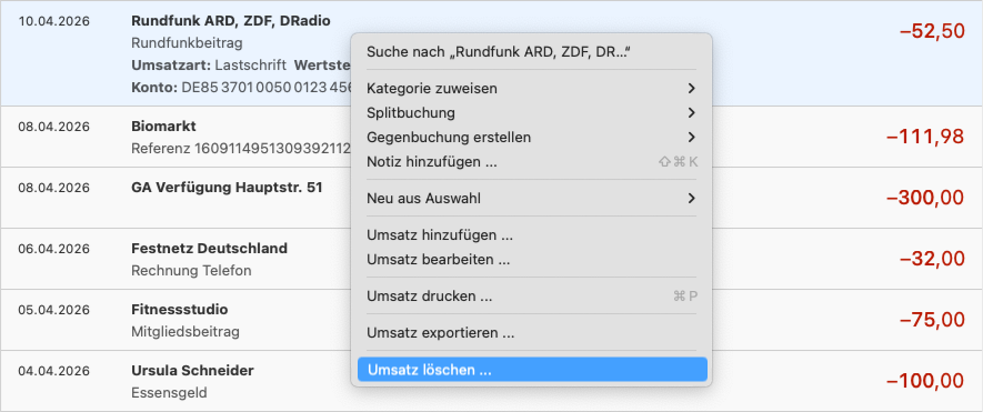 Der Befehl dafür befindet sich im Kontextmenu. Um das Kontextmenu zu öffnen, klicken Sie mit der rechten Maustaste auf den Umsatz. Alternativ können Sie auch mit der linken Maustaste oder mit dem Trackpad klicken, wenn Sie gleichzeitig die «Control-Taste» auf der Tastatur drücken. Wählen Sie dann «Umsatz löschen» aus dem Kontextmenu.